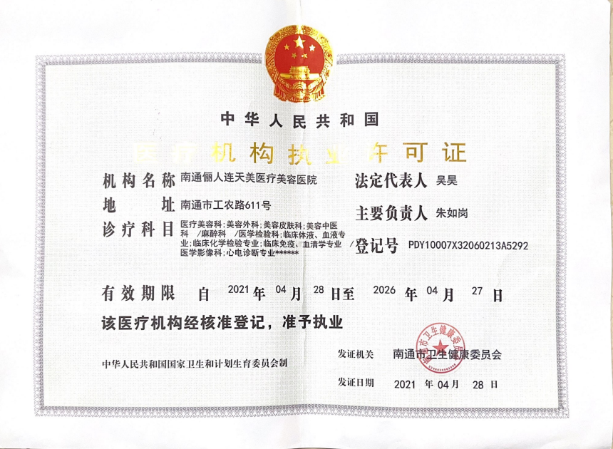 南通儷人連天美醫(yī)療美容醫(yī)院是與著名的醫(yī)療美容集團合作建立的醫(yī)院,醫(yī)院提供高品質的醫(yī)療美容服務。2008年,南通儷人連天美醫(yī)療美容醫(yī)院落戶南通,成為由南通衛(wèi)生局審批的專業(yè)醫(yī)療美容醫(yī)院。南通儷人連天美醫(yī)療美容醫(yī)院,特別設有專業(yè)的整形美容科、皮膚美容科和微創(chuàng)美容科三大科室,致力于為廣大求美者提供全方位的醫(yī)療美容服務。南通儷人連天美醫(yī)療美容醫(yī)院為求美者建立個人終生美麗檔案,一對一進行細致服務。 11年來,南通儷人連天美醫(yī)療美容醫(yī)院,不斷引進先進設備,不斷完善醫(yī)美技術,一批優(yōu)秀、專業(yè)而穩(wěn)定的醫(yī)生團隊,為無數求美者鑄就美麗夢想。